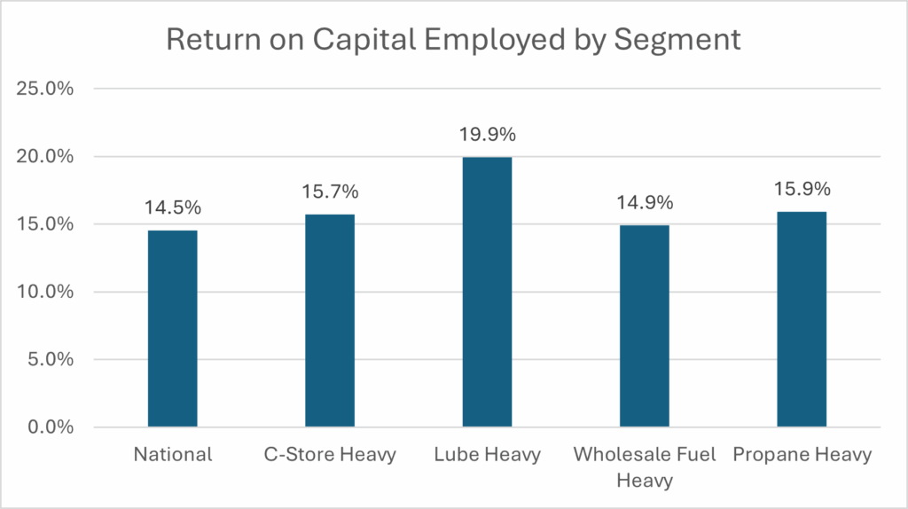 Lube Heavy Firms leads all segments with a ROCE of 19.9%, a full 5.4 percentage points above the national average of 14.5%. Propane Heavy Firms claims second at 15.9%, followed closely by C-Store Heavy Firms at 15.7%. Wholesale Fuel Heavy Firms finishes last at 14.9%, barely clearing the national average. All four business segments generated ROCE higher than the national average, indicating firms concentrated on one segment of the industry performed better than more full line firms with multiple petroleum marketing business lines. All four segments saw ROCE decline year-over-year, but the magnitude of those declines varied.