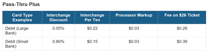 - Pass-Thru Plus: Unbranded stations get to choose their own processor, and that usually means access to interchange-plus pricing (aka Pass-thru Plus), where you pay the actual interchange cost set by Visa, Mastercard, and the other networks plus a small, transparent processor markup.