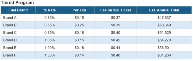 - Tiered: Branded programs require you to process cards through the oil company’s designated network using tiered pricing.