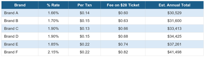 Under interchange-plus, a Visa credit transaction at a $28 average ticket carries an effective interchange rate of roughly 1.80%. Add a flat $0.03 processor markup and that is your total cost. Compare that to 2.15% + $0.22 from the most expensive branded program, and the per-transaction savings are obvious.